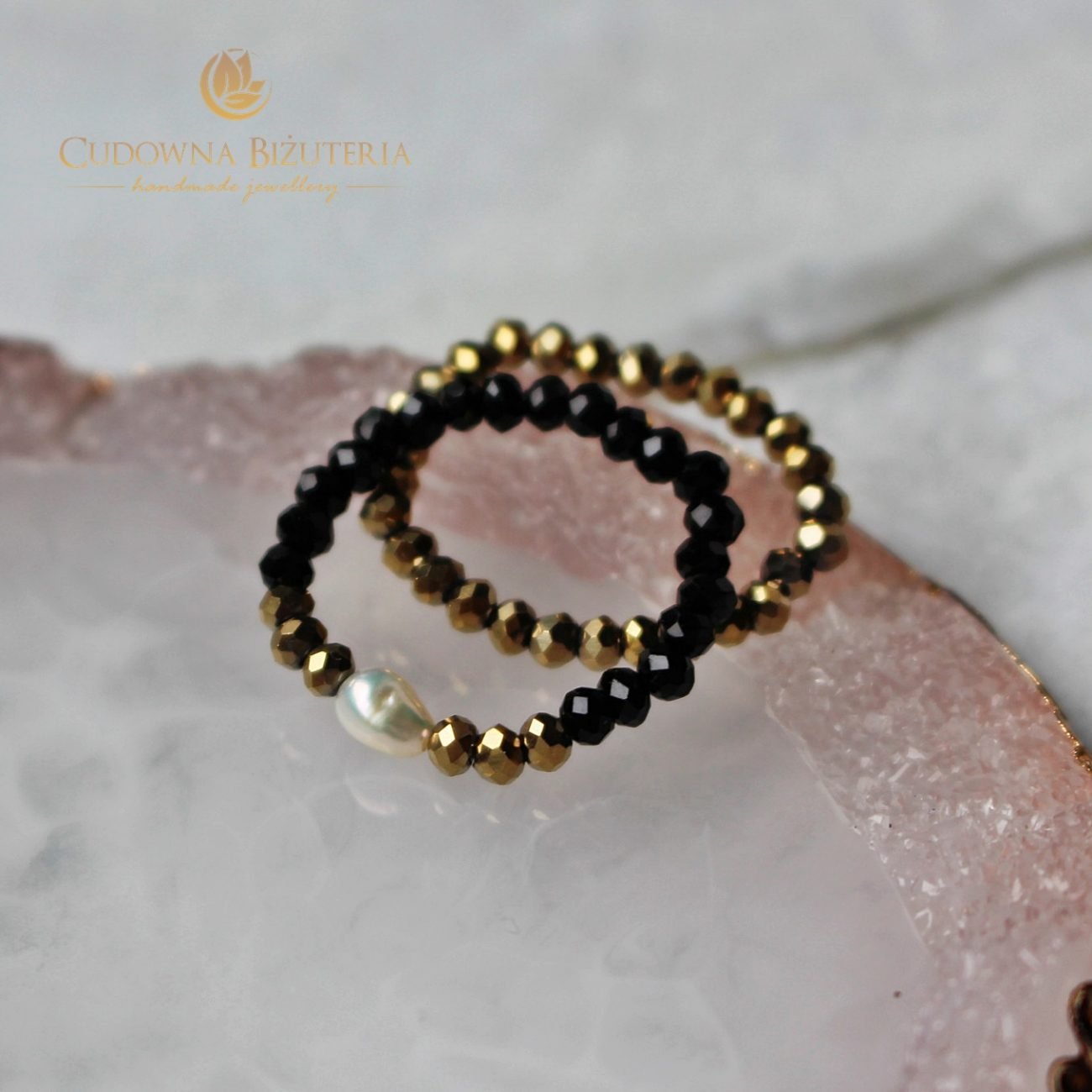 Zestaw kryształowych pierścionków czarny z perełką i złoto pirytowe