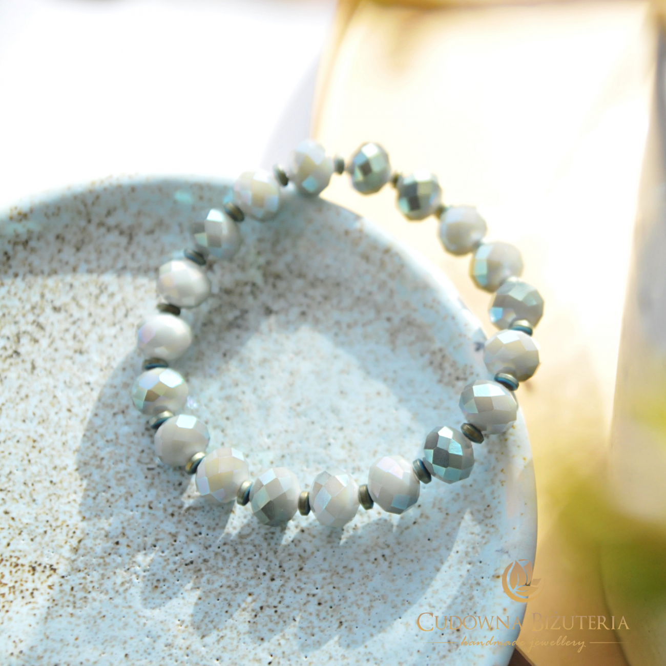 Proponujemy bransoletkę wykonaną z kryształów w rozmiarze 10mm z dodatkiem przekładek z hematytu w kolorze zielonym. Kolor bransoletki to wspaniała szarawa zieleń. Każdy kryształek posiada ciemniejszą stronę z pięknym połyskiem ciemniejszej zieleni.